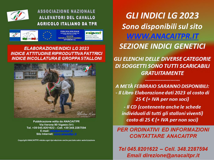 Gli indici LG 2023 sono disponibili sul sito www.anacaitpr.it sezione indici genetici. Gli elenchi delle diverse categorie di soggetti sono tutte scaricabili gratuitamente