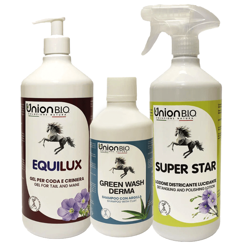 1 shampoo 500ml, 1 lucidante e districante 1l, 1 ristrutturante per coda e criniera sfibrata 1l