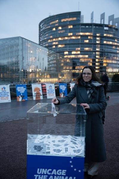 Gli attivisti, vestiti in abiti neri e con maschere da polli, hanno inscenato un finto voto a favore di una migliore legislazione per gli animali da allevamento. Davanti al Parlamento europeo hanno “votato” simbolicamente anche circa 20 parlamentari di 9 paesi, tra cui l’eurodeputata e responsabile Ambiente della segreteria nazionale del Partito Democratico Annalisa Corrado (S&D), che ha dichiarato che «la tutela del benessere animale è fondamentale per la salute di tutti noi, così come previsto dal principio One Health e per questo è importante che l’Europa si doti di normative più adeguate».