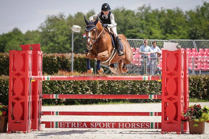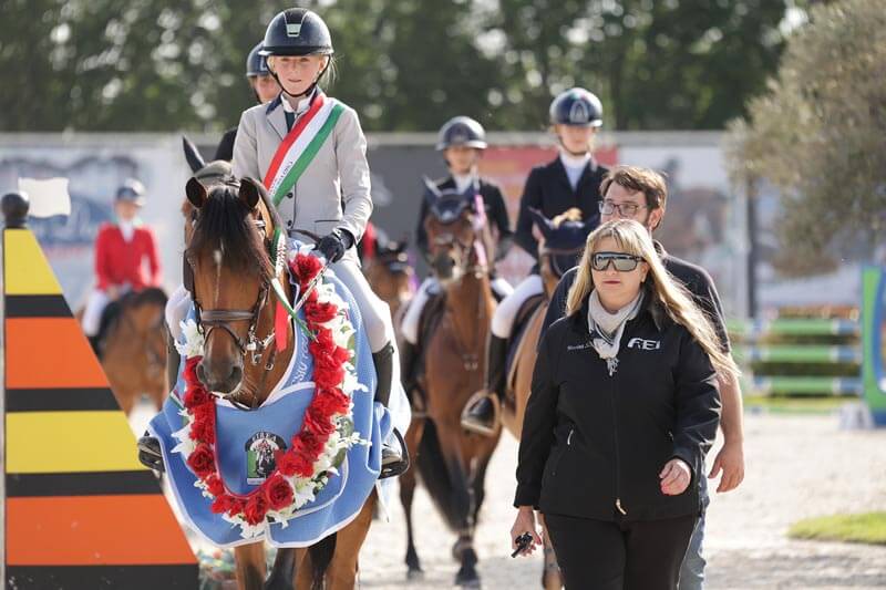 The Pony riders were last to jump at the end of a very long and emotional day. The 1.30m track proved testing and only two combinations finished on a clean sheet. Everyone held their breath when the two young lady riders entered the ring for the jump-off. Rachele Zendrini and Lacoste (0/4 in 40,71 seconds) went first for Italy. 4 Faults at the last fence left the door wide open for Dutch Mienie Vos who took victory with a double clear on Pjotr Van De Groenheuvel (0/0 in 42,99 seconds) making it 2 in a row for The Netherlands and for the rider herself after her win in the Children GP.