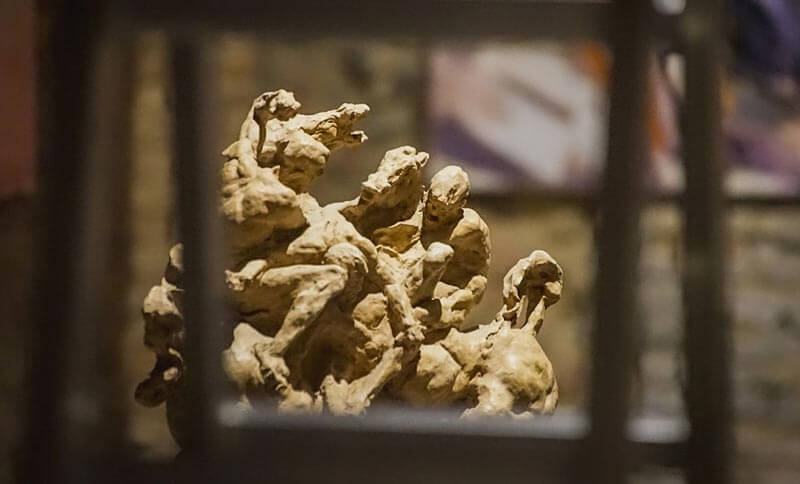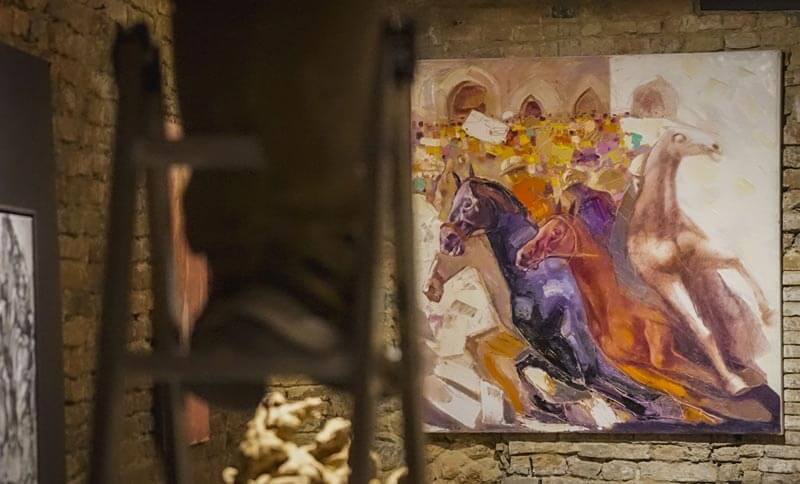 Due bronzi di Vivianne Duchini impreziosiscono la prima sala e accompagnano verso la seguente, che potremmo chiamare ‘delle battaglie’: il San Giorgio di Marcello Tommasi scalpita tra luce e ombra, i Cavalli di San Marco di Carol Marano guardano cauti le due potenti battaglie equestri di Federico Severino declinate a terracotta e carboncino. A lato i disegni delicati e colori forti per Marta Mangiabene, artista pievese che racconta impressioni di sogno ma studiate nei dettagli più minuti, mentre la forza scenografica dei grandi quadri di Armand Xhomo, ‘Il palio di Siena’ e ‘Le Nuvole’, si prende trionfale la parete di fondo, tra un altro bronzo leggero di Duchini e i tre dipinti a olio di Tommaso Andreini, deciso nel tratto e nei colori come nella scelta del soggetto guerresco.
