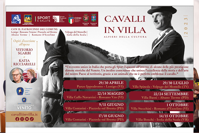 “Cavalli in Villa” debutterà a Lonigo (Vicenza) con la prima tappa 2023, portando il nobile animale oltre gli steccati dei propri circuiti, vicino al grande pubblico e al centro di otto memorabili eventi gratuiti e aperti al pubblico. Il cavallo si conferma l’affascinante animale capace non solo di emozionare ma anche di educare, sensibilizzare e aiutare: intorno alle numerose gare, spettacoli e battesimi della sella ruoterà un ricchissimo e nuovo carnet di iniziative ed eventi, come tour in E-Bike, a cavallo e con le auto storiche, fino ad attività legate all’informazione dei giovani su temi fondamentali, grazie al coinvolgimento in ogni tappa delle scuole del territorio.