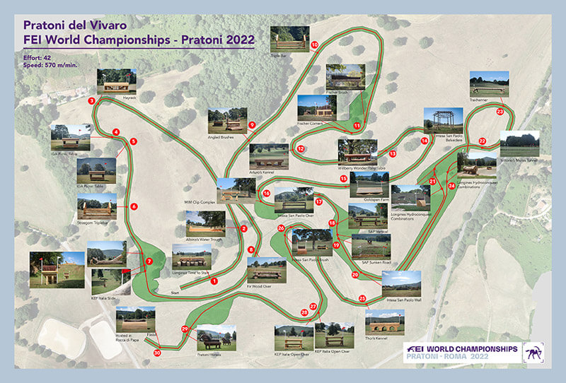 Il percorso di 5.600 metri prevede 42 salti su 30 ostacoli, tra cui uno, il fontanile (numero 2) risale all’Olimpiade di Roma 1960. I binomi dovranno percorrerlo ad una velocità media di 570 metri al minuto in un ‘optimum time’ di 9 minuti e 50 secondi.