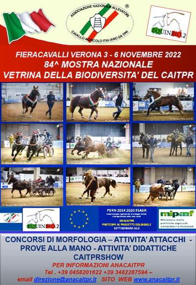 ANACAITPR organizzerà la 84^ Mostra Nazionale di Razza congiuntamente alla Vetrina Nazionale della Biodiversità. un appuntamento con il CAITPR a 360° gradi: Concorsi morfologici, CAITPRSHOW, Campionato di conduzione alla mano e momenti didattici sulla Razza e sui Programmi tecnici sia del Libro Genealogico sia del PSRN. Gli appassionati potranno così ammirare il CAITPR sia dal punto di vista dei risultati d’allevamento e della selezione ma anche come soggetto da lavoro proposto nelle sue diverse sfaccettature: dal Concorso di Conduzione alla mano Agility sino al CAITPRSHOW.