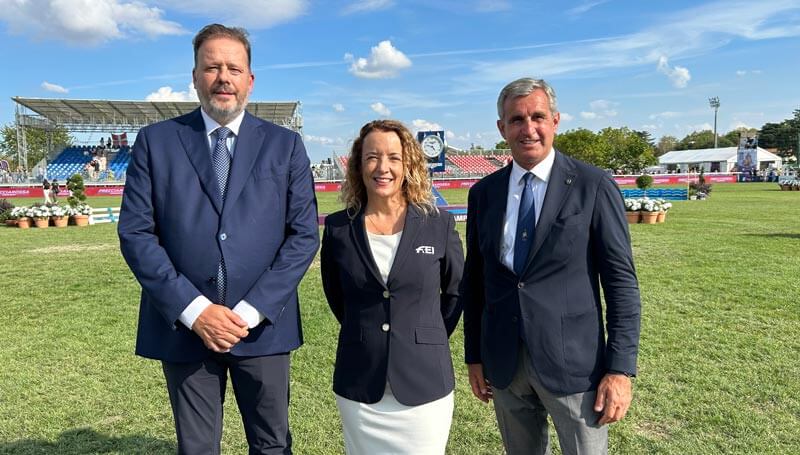 Stretta di mano, in occasione del FEI Jumping European Championship di Milano, tra il segretario generale della FEI, Sabrina Ibáñez, Marco Di Paola, presidente FISE, e Federico Bricolo, presidente di Veronafiere.