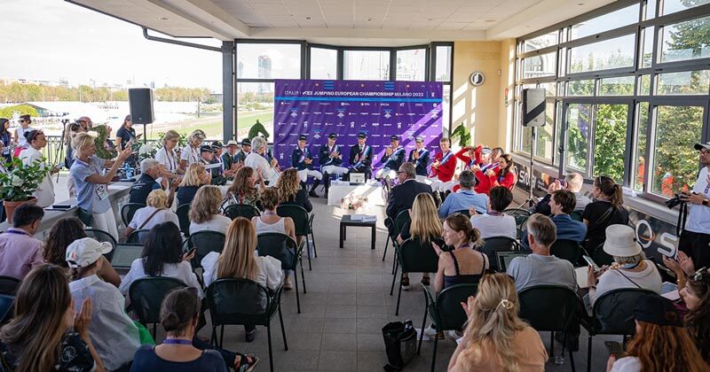 La conferenza stampa con la Svezia campione d’Europa e le altre squadre salite sul podio, Irlanda e Austria, s’è tenuta sulla splendida terrazza panoramica in cima alla Palazzina del Peso dell’Ippodromo Snai San Siro.