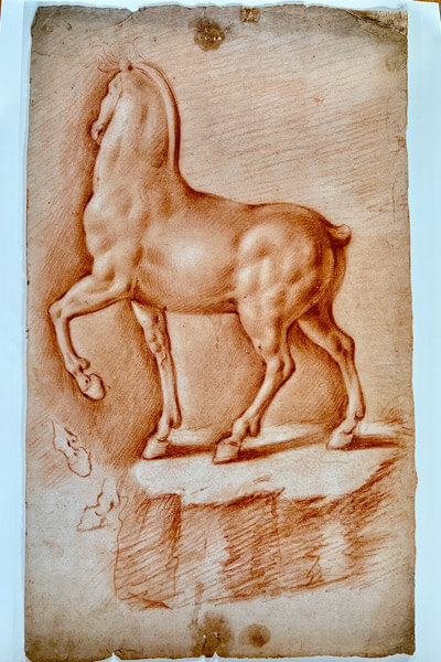 Tuttavia il disegno recentemente scoperto in collezione francese mostra forse il più riuscito esemplare di “cavallo ideale” tra i soggetti equini noti sino ad oggi: la scoperta di questa opera ed il relativo studio sono dunque di grande importanza poiché raccolgono gli anni di studi di Leonardo volti alla ricerca della “perfezione”.