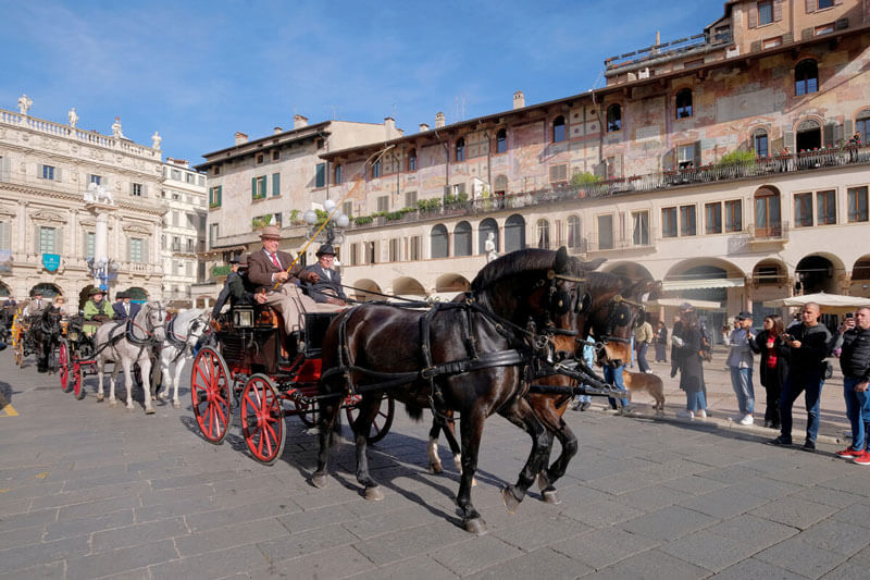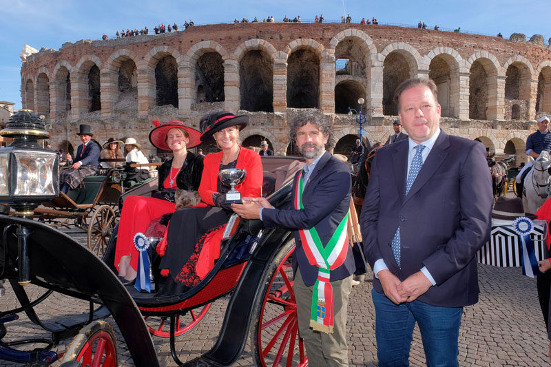 le sfilate in città con il XII Concorso “Verona In Carrozza”, il Concorso di Eleganza con la classica Prova di Presentazione che sabato ha richiamato centinaia di visitatori, tutti a vedere ed applaudire 20 equipaggi con carrozze d’epoca , giudicati per la loro filologia da una giuria di giudici internazionali i quali hanno assegnato il premio “Best in Show” all’attacco a la Demi-d’aumontdi Giuseppe Usai, raro a vedersi, caratterizzato dall’assenza di cocchiere ma dalla presenza di un cavaliere sul cavallo di sinistra in formazione di pariglia.