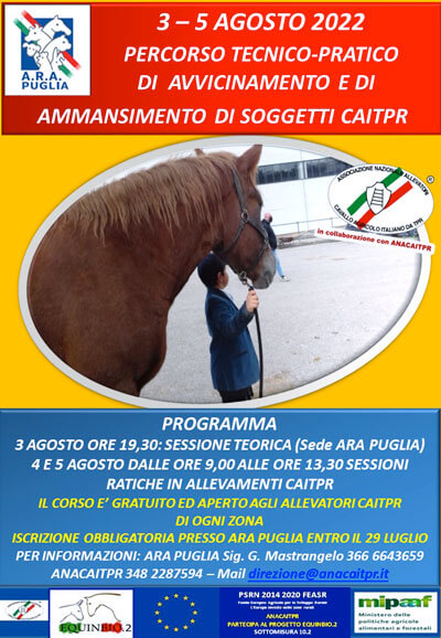 Organizzato da ARA PUGLIA in collaborazione con ANACAITPR, l’iniziativa è aperta a tutti gli allevatori CAITPR di tutta Italia ed è del tutto gratuito. Si apre la sera del 3 agosto con la sessione teorica per proseguire poi con le fasi pratiche il 4 ed il 5 agosto in aziende di Razza iscritte al Libro Genealogico. Un appuntamento diverso dai tanti Meeting e dalle tante Mostre che punteggiano il calendario del CAITPR, ma non del tutto slegato anche da queste attività. In realtà si tratta di un vero e proprio servizio tecnico di supporto agli allevatori, in quanto la professionalizzazione nella gestione dei soggetti è innanzitutto importante nella vita quotidiana dell’allevamento, ma anche nel momento di preparazione per le Mostre dove la qualità di presentazione è fondamentale per i risultati di concorso e per implementare le opportunità e la promozione commerciale dei propri cavalli.