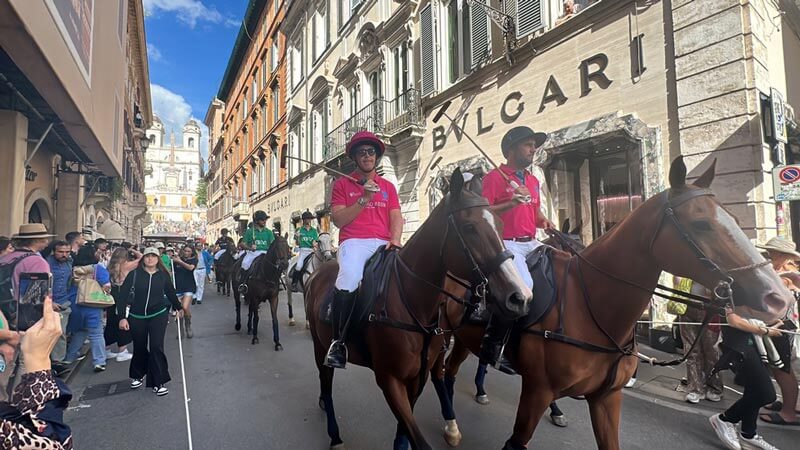 Tutti con lo smartphone in mano a immortalare momenti tanto belli quanto inediti: e così un pomeriggio di shopping si è trasformato nell’occasione per ammirare la festa dell’Italia Polo Challenge e, perché no, mettere in calendario una serata al Galoppatoio. I protagonisti si sono ritrovati in Piazza del Popolo (novità rispetto alle precedenti edizioni), percorrendo poi Via del Corso, Largo Goldoni e Via dei Condotti, fino ad arrivare a ridosso di Piazza di Spagna. E poi il percorso contrario, con un altro bagno di folla ad attendere i protagonisti che da domani saranno in campo: in mezzo alla folla di curiosi, anche il fantasista del Napoli Khvicha Kvaratskhelia. Al termine della sfilata, i partecipanti sono stati ricevuti dal Presidente dell’Associazione via Condotti, Gianni Battistoni, per un brindisi d’onore nel cortile delle scuderie di Palazzo Ruspoli.