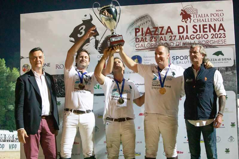 Roma, 28 maggio – Il trionfo di Harpa – HPE nella tappa di Piazza di Siena di Italia Polo Challenge porta la firma di Fabrizio Facello, Therence Cusmano e Pedro Llorente. In una splendida finale, giocata sul campo in sabbia del Galoppatoio davanti a tribune strapiene (1000 spettatori si sono alternati sugli spalti), Harpa – HPE si è imposta con un gol e mezzo di vantaggio (7-5 1/2) su U.S. Polo Assn., che vedeva in campo Stefano Giansanti, Fabrizio Murgolo e Patricio Rattagan. Si chiude così un’altra tappa del circuito di arena polo organizzato in collaborazione con la FISE, che ha portato centinaia di persone a seguire l’evento nei tre giorni di gara, accompagnate da uno speaker d’eccezione: l’attore Roberto Ciufoli, grande appassionato di polo e che ha affiancato al microfono la storica voce del polo italiano, quella di Gian Luca Magini. Al terzo posto si è classificata Union (Massimo Giambarresi, Goffredo Cutinelli Rendina, Paolo Grillini), che ha superato 8-6 1/2 Engel & Völkers (Davide Fioranelli, Angel Valdez, Miguel Lagos Marmol). La terza e ultima tappa dell’Italia Polo Challenge 2023 è in programma dal 19 al 22 luglio in Sardegna, sul campo di Abbiadori.