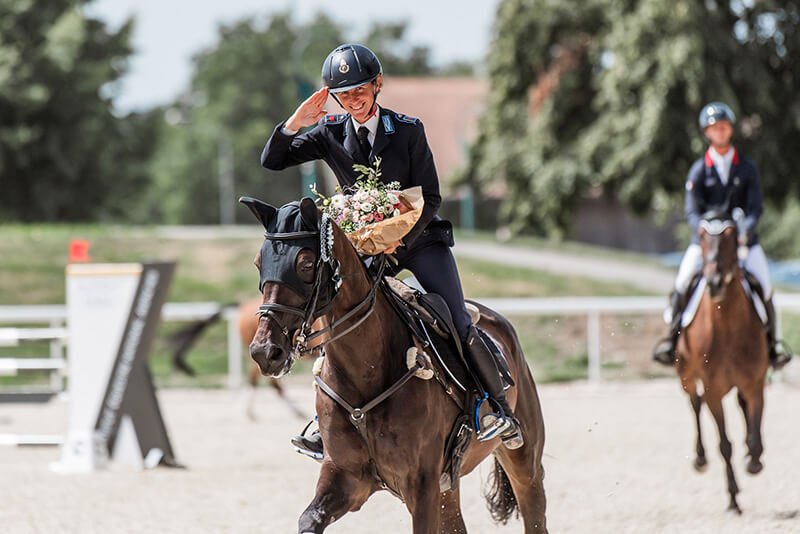 Il quartetto italiano era composto dall’appuntato scelto Susanna Bordone con Imperial van de Holtakkers (43.30) che ha anche centrato il sesto posto nella classifica individuale, dall’assistente delle Fiamme Azzurre Evelina Bertoli con Quick Joe (50.40 pn; 11° posizione individuale), dall’agente delle Fiamme Azzurre Fosco Girardi con Euphorie (55.20; 18°) e dallo young rider caporale Matteo Orlandi con Quality in Time (62.50; 27°).