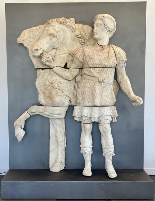 E cioè l’uomo che fu protagonista della massima espansione dell’impero romano? La storia è bella e avvincente e assume i contorni di una historical-fiction, con tanto di ‘giallo’ sull’identità del personaggio principale. La scultura in marmo di grande pregio – siamo attorno ai 14 quintali complessivi – esposta nel Casino dell’Orologio a Villa Borghese, è conosciuta, appunto, come: “Il Rilievo del cavaliere”, opera che appartiene al nucleo seicentesco della Collezione Borghese e rappresenta un giovane cavaliere con corazza a squame e stivali decorati da leontè – teste di leone tipiche delle decorazioni militari dell’epoca – che tiene con la mano destra le redini di un cavallo. L’elevata qualità, le notevoli dimensioni del rilievo (alto quasi due metri, largo 1,60), il tipo di corazza indossata generalmente da militari di alto rango, la ricca bardatura del cavallo con tanto di fiancali decorati da due pantere affrontate, hanno portato all’ipotesi che, come minimo, possa trattarsi di un alto esponente della Cavalleria personale dell’imperatore (Equites singulares Augusti) e che l’opera sia riconducibile all’età traianea-adrianea (prima metà del II sec. d.C.). E però proprio quella ricca foggia nei finimenti e nei dettagli del Cavaliere, non esclude l’ipotesi più suggestiva e cioè che quell’uomo che nella mano sinistra impugnava probabilmente una daga, la spada corta romana, possa essere davvero l’imperatore Traiano.