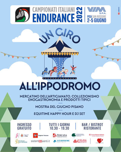 VIM Spa Campionati Italiani di Endurance 2022 sono un evento FISE (Federazione Italiana Sport Equestri) e FEI (Federazione Equestre Internazionale) organizzato da sistemaeventi.it e Italia Endurance Asd in collaborazione con l’Ippodromo di San Rossore e con il patrocinio del Comune di Pisa, del Parco Regionale Migliarino San Rossore Massaciuccoli, della Regione Toscana e di Toscana Promozione Turistica. VIM Spa è il title sponsor che dà il nome all’evento, l’associazione Per donare la vita Onlus lo sponsor solidale.
