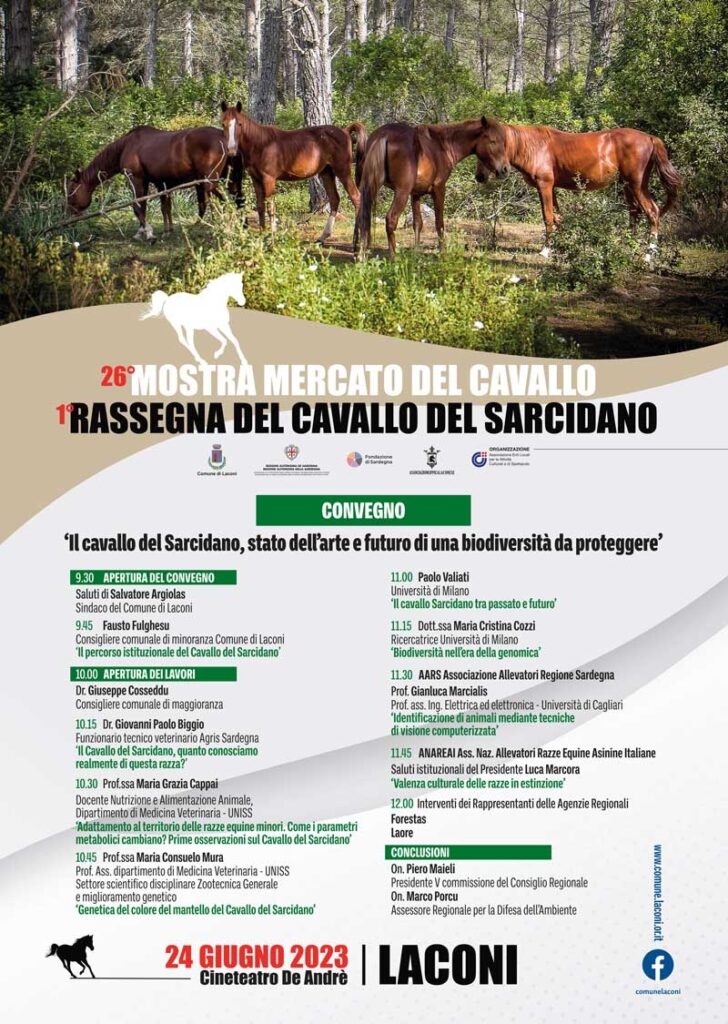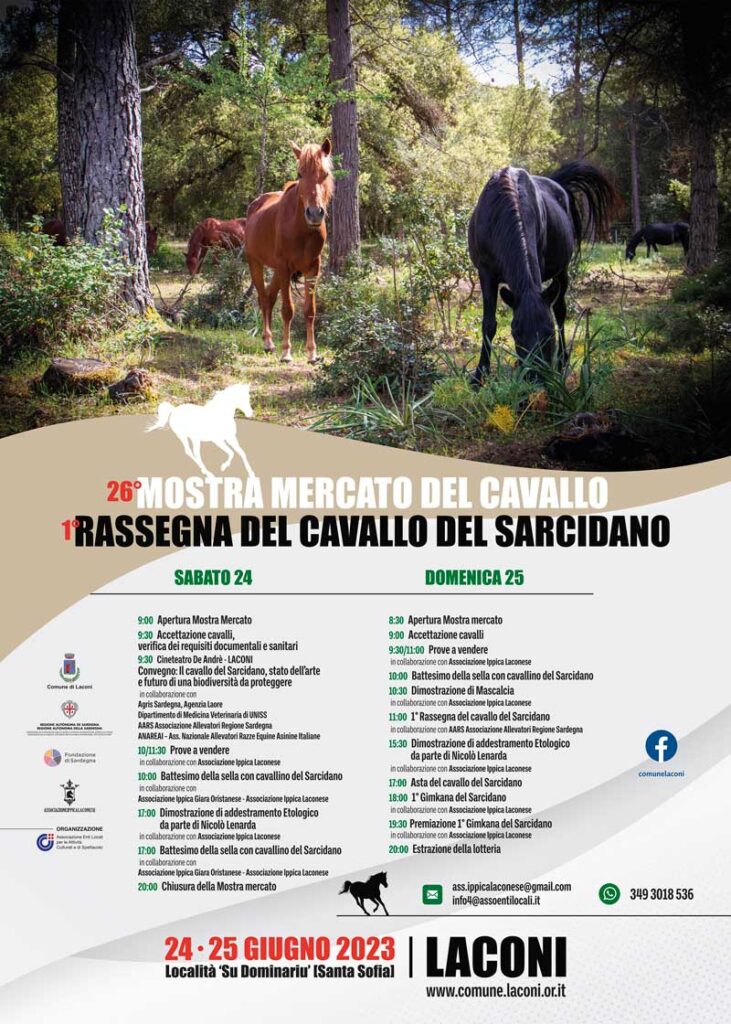 Per sabato 24 e domenica 25 giugno p.v., a Laconi, in località Su Dominariu (Santa Sofia), è stata pertanto programmata la 26esima Mostra-Mercato del Cavallo, cui verrà affiancata la prima Rassegna del Cavallo del Sarcidano. Due giorni di festa che l’Amministrazione comunale ha voluto dedicare al raro animale che vive nel suo territorio. L’evento, che si protrarrà dalla mattina alla sera, è organizzato dal Comune di Laconi, con il sostegno della Fondazione di Sardegna, della Regione Autonoma della Sardegna – Assessorato P.I. BB. CC. e dell’Associazione Ippica Laconese; il coordinamento organizzativo è affidato all’Associazione Enti Locali per le attività culturali e di spettacolo.